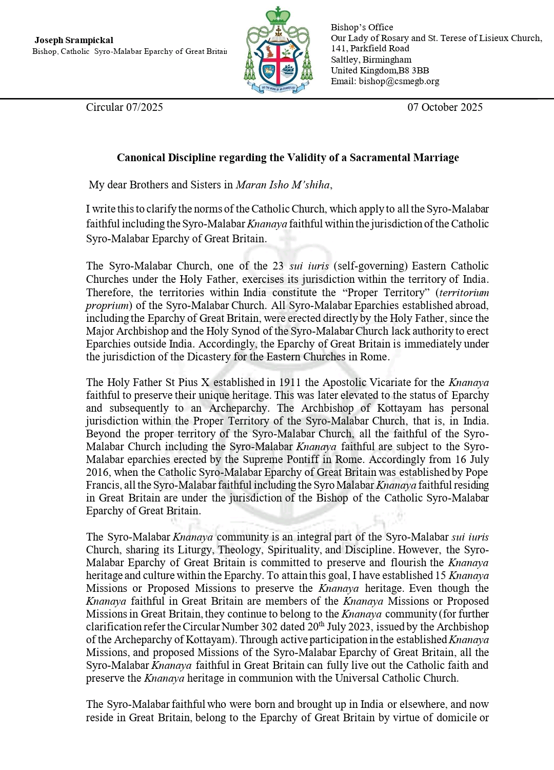ലണ്ടൻ: യുകെയിലെ ക്നാനായ കത്തോലിക്ക വിശ്വാസികളുടെ തനിമയും പാരമ്പര്യവും സംരക്ഷിക്കുന്നതിനും, രൂപതാംഗത്വം സംബന്ധിച്ചു നിലവിലുള്ള ആശങ്കകൾ പരിഹരിച്ചുകൊണ്ടും ഗ്രേറ്റ് ബ്രിട്ടൻ സീറോമലബാർ രൂപത പുതിയ സർക്കുലർ പുറത്തിറക്കി. ക്നാനായ കത്തോലിക്ക വിശ്വാസികളും മറ്റ് സീറോമലബാർ സഭാംഗങ്ങളും അവരുടെ വിവാഹം യുകെയിൽവച്ചു നടത്തുമ്പോൾ പാലിക്കേണ്ട നടപടിക്രമങ്ങളെക്കുറിച്ചും കൂടുതൽ വ്യക്തത വരുത്തിക്കൊണ്ടാണ് പുതിയ സർക്കുലർ പുറത്തിറക്കിയിരിക്കുന്നത്.