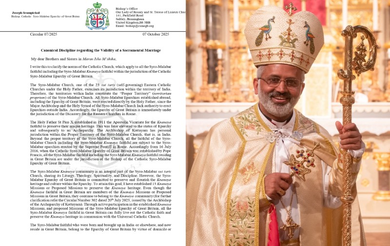 ലണ്ടൻ: യുകെയിലെ ക്നാനായ കത്തോലിക്ക വിശ്വാസികളുടെ തനിമയും പാരമ്പര്യവും സംരക്ഷിക്കുന്നതിനും, രൂപതാംഗത്വം സംബന്ധിച്ചു നിലവിലുള്ള ആശങ്കകൾ പരിഹരിച്ചുകൊണ്ടും ഗ്രേറ്റ് ബ്രിട്ടൻ സീറോമലബാർ രൂപത പുതിയ സർക്കുലർ പുറത്തിറക്കി. ക്നാനായ കത്തോലിക്ക വിശ്വാസികളും മറ്റ് സീറോമലബാർ സഭാംഗങ്ങളും അവരുടെ വിവാഹം യുകെയിൽവച്ചു നടത്തുമ്പോൾ പാലിക്കേണ്ട നടപടിക്രമങ്ങളെക്കുറിച്ചും കൂടുതൽ വ്യക്തത വരുത്തിക്കൊണ്ടാണ് പുതിയ സർക്കുലർ പുറത്തിറക്കിയിരിക്കുന്നത്.