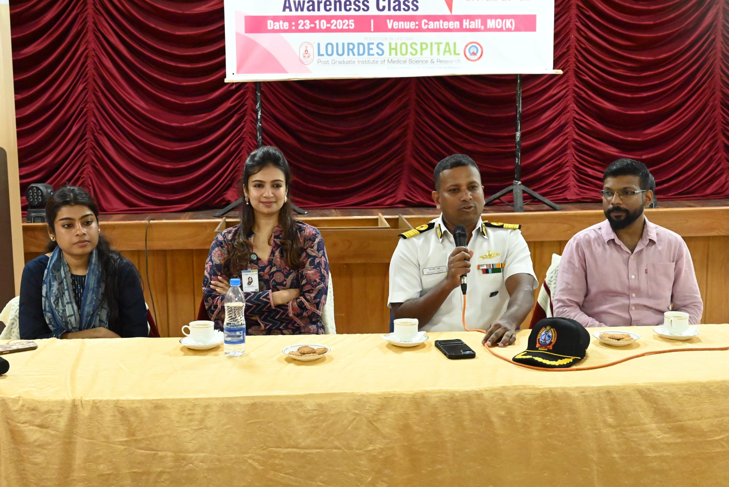 ലൂർദ് ആശുപതി ഗൈനക്കോളജി വിഭാഗം കൺസൾട്ടൻ്റ് ഡോ: കാർത്തിക ചങ്ങരത്ത് സ്തനാർബുദം കാരണങ്ങൾ, സ്വയം പരിശോധന, വ്യായാമങ്ങൾ, പ്രതിരോധ മാർഗ്ഗങ്ങൾ എന്നിവയെ കുറിച്ച് ക്ലാസ്സ് നയിച്ചു. നേവൽ ബേസ് മെറ്റീരിയൽ സൂപ്രണ്ട് കമ്മഡോർ ബിശ്വജിത് ദത്ത ബോധവൽക്കരണ ക്ലാസ് ഉദ്ഘാടനം ചെയ്തു .
