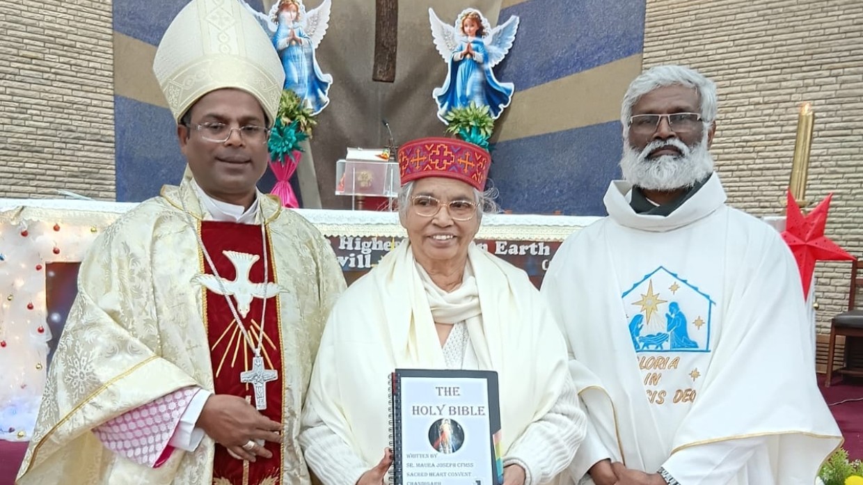 സിംല- ചണ്ഡീഗഡ്: വിശുദ്ധ ബൈബിളിന്റെ പൂർണ്ണമായ കൈയെഴുത്ത് പ്രതി പൂർത്തിയാക്കിയതിന് ഷിംലയിലെ സിസ്റ്റർ മൗറ സിഎഫ്എംഎസ്എസിനെ സിംല-ചണ്ഡീഗഡ് രൂപത അനുമോദിച്ചു – അപൂർവവും ആഴമേറിയതുമായ ആത്മീയ നാഴികക്കല്ല് അടയാളപ്പെടുത്തിക്കൊണ്ട്, വർഷങ്ങളുടെ പ്രാർത്ഥന, അച്ചടക്കം, ദൈവവചനത്തോടുള്ള ആഴമായ ആദരവ് എന്നിവയാൽ രൂപപ്പെടുത്തിയ ഒരു നേട്ടം.