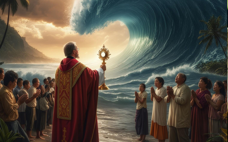 വന് ശക്തിയോടെ തിരമാല തീരത്തേക്ക് വരുമെന്ന വിലയിരുത്തല് വിദഗ്ധര് നടത്തി. മുന്കാല ചരിത്രവും അത് തന്നെയായിരിന്നു. തങ്ങളുടെ എല്ലാം നഷ്ട്ടമാകാന് പോകുന്നുവെന്ന യാഥാര്ത്ഥ്യം ഉള്ക്കൊള്ളാന് ആ ജനത്തിനു കഴിയുമായിരിന്നില്ല. ഒരു വശത്ത് നിസഹായവസ്ഥ, മറുവശത്ത് പരിഭ്രാന്തി.എന്നാല് മറുപടിയായി, ടുമാകോയിലെ അന്നത്തെ ഇടവക വൈദികനായ ഫാ. ജെറാർഡോ ലാറോണ്ടോ, പള്ളിയിലേക്ക് ഓടിക്കയറി, തിരുവോസ്തി അരുളിക്കയിലേക്ക് മാറ്റി ജനത്തിന്റെ അടുത്തേക്ക് പോകുകയായിരിന്നു.